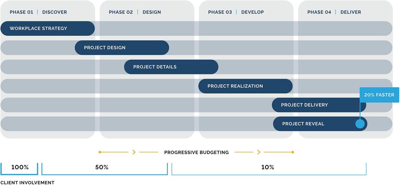 An integrated approach is where strategy, design, and execution combine to bring your workplace vision to life through our unified team and holistic approach. At Aura, you get one entity, one contract, one seamless flow of communication and work from concept to completion. An integrated design/build approach cuts the bidding process and multiple contracts while putting the client under contract with one entity delivering a complete construction project. One firm will supply and oversee all construction processes up to completion. A fixed-sum contract at AURA ensures cost control and transparency. Once the design is done, we implement a stipulated sum contract at the start of the construction phase. Until then, we provide progressive budgeting throughout the process, beginning with 15, 30, and 60 percent drawings.